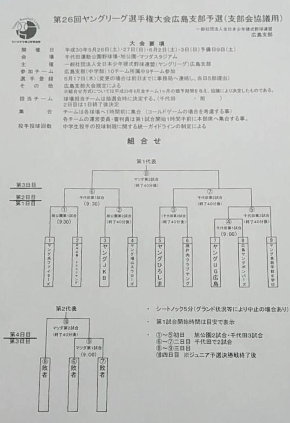 第26回ヤングリーグ選手権大会広島支部予選予定 第26回ヤングリーグ選手権大会広島支部予選予定 【日時】5月26日(土)~ 【試合会場】旭運動公園野球場 【対戦相手】ヤング福山スワローズ 全国大会をかけて戦う1年間の中でも大事な大会です☆ みなさんの応援を力に頑張りますので、宜しくお願いします⚾