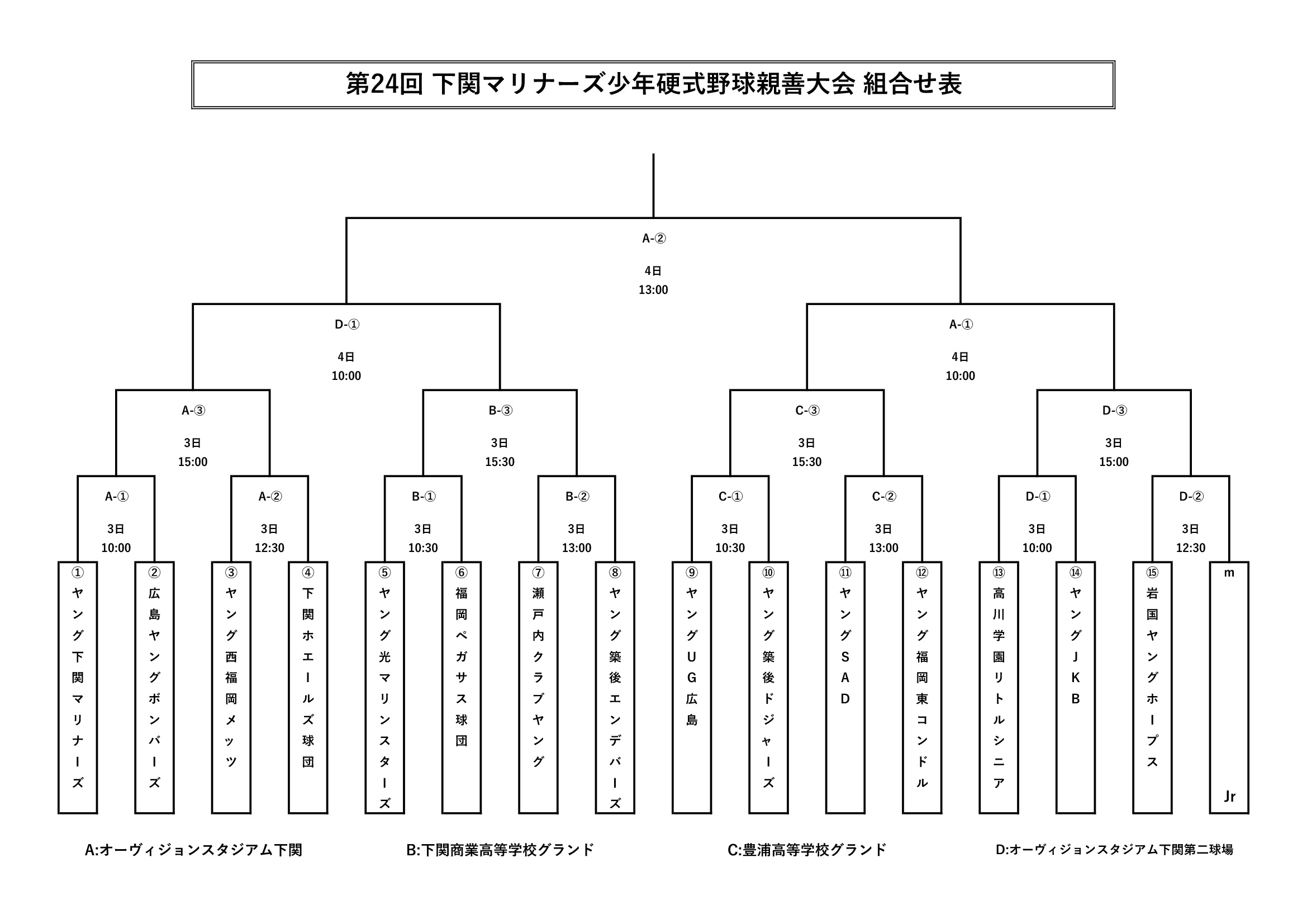第24回 下関マリナーズ少年硬式野球親善大会 組合わせ 第24回 下関マリナーズ少年硬式野球親善大会 【開催日】8月3日(土)~ 【試合会場】オーヴィジョンスタジアム下関第二球場 【対戦相手】高川学園リトルシニア 応援よろしくお願いします。